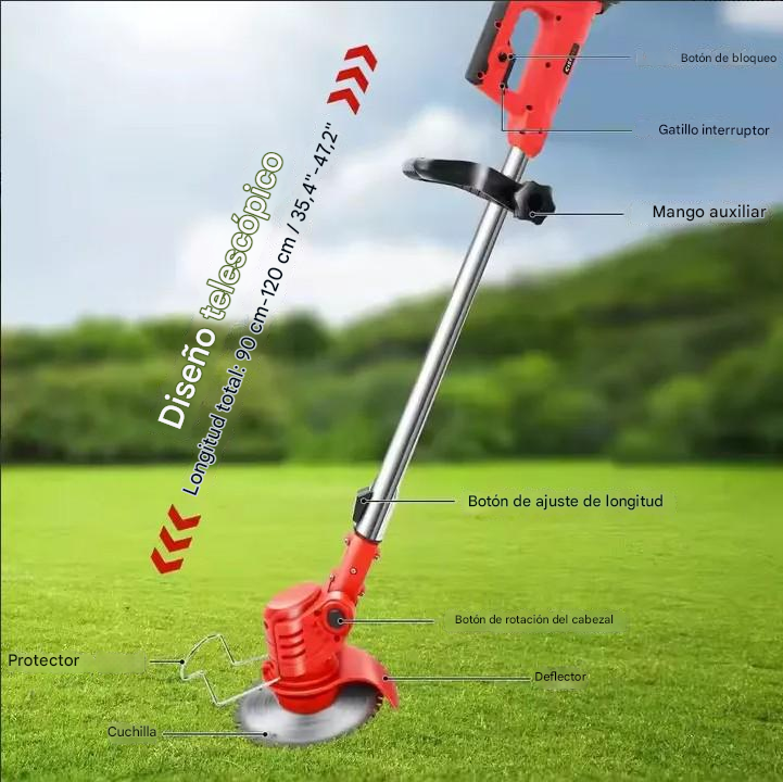 Esta guadaña combina potencia, comodidad y diseño inteligente. Su motor de 800 W y baterías recargables de 12 V garantizan un corte eficiente, continuo y sin interrupciones. Olvídate de enredos o de buscar enchufes en el jardín.